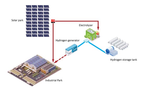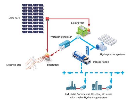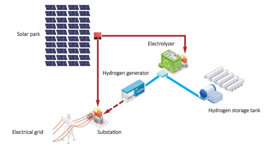 Part of the electricity generated by the solar modules goes directly to the industrial or commercial area or hospitals, etc. outside the medium-voltage electricity supply network. The other part of the electricity generated by the solar modules provides the energy supply needed for electrolysis. Hydrogen generated during electrolysis is stored in tanks.