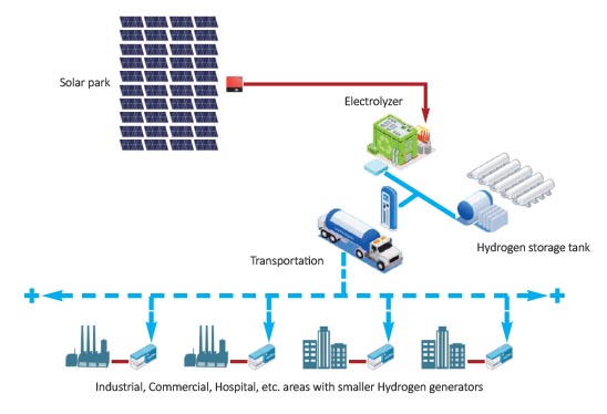 The electricity generated by the solar modules provides only the energy supply needed for electrolysis. Hydrogen generated during electrolysis is stored in tanks. Hydrogen is transported in tank trucks for hydrogen generators to different locations.